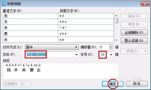 第三步:在弹出的“拼音指南”对话框中,设置拼音的字体和字号,单击“确定”按钮。