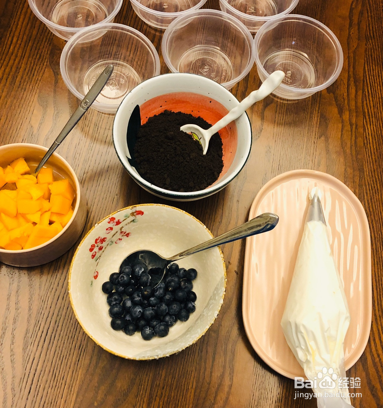 5.所有用料准备就绪。鲜奶油装入裱花袋中。