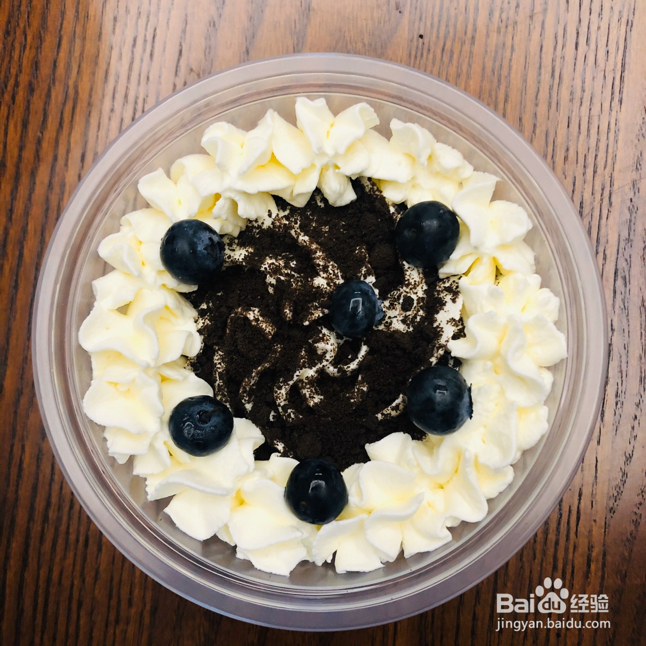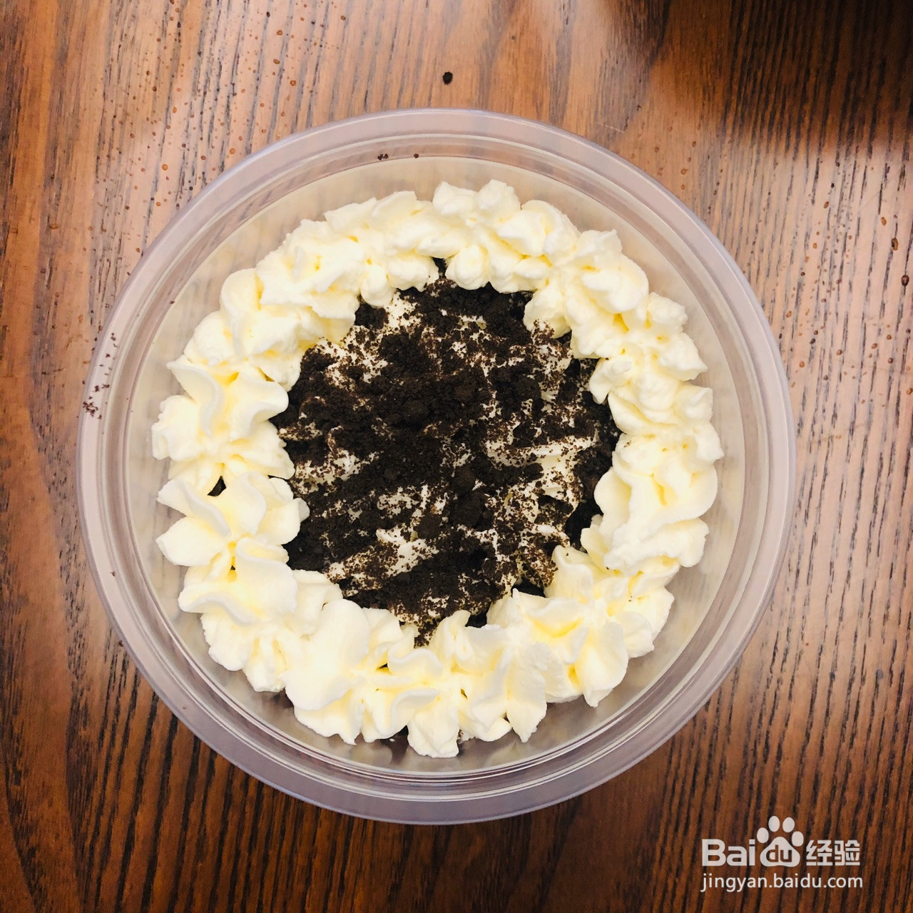 7.芒果铺一层,撒一层奥利奥饼干碎,再打一圈奶油。