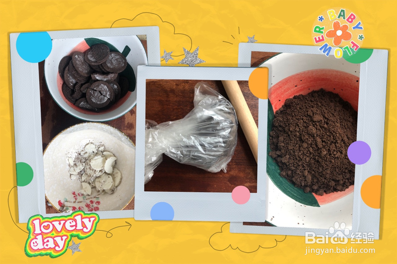 2.将奥利奥饼干的夹心去掉。将饼干装入保鲜袋里,用擀面杖将其打碎。如图3所示,捣碎后备用。