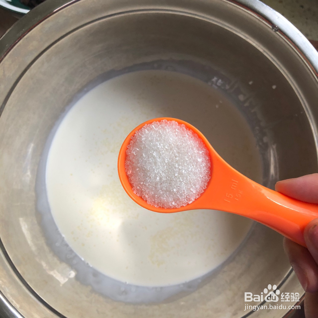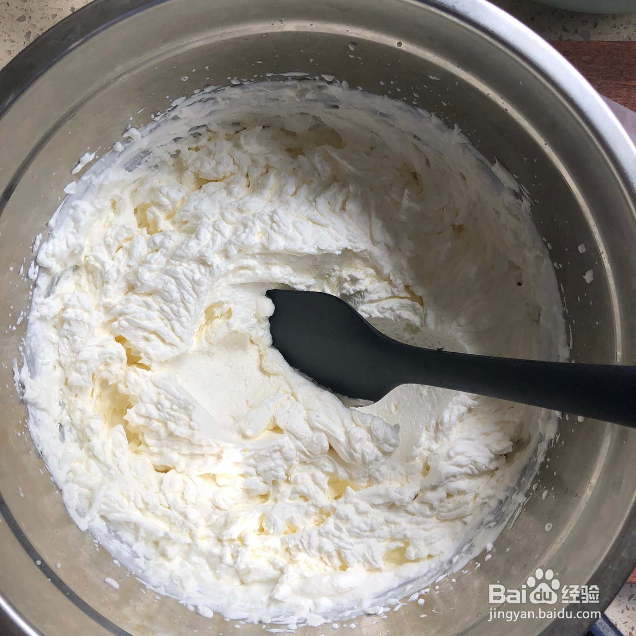3.将500毫升鲜奶油倒入搅拌盆内,加入45克白糖打发,白糖分3次加入,就是打发一会儿加入一点,循环3次。