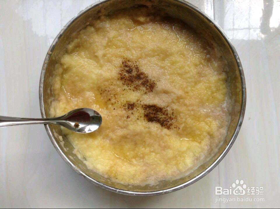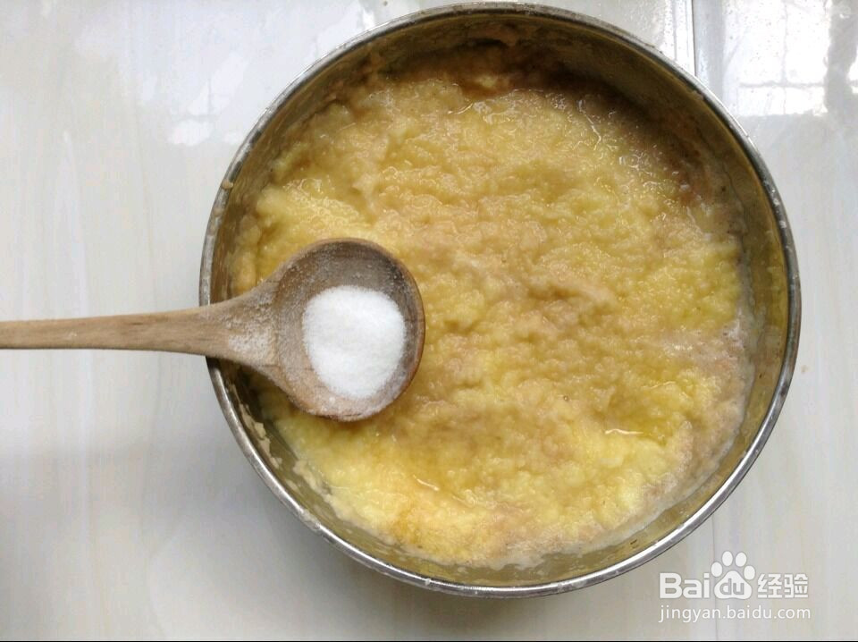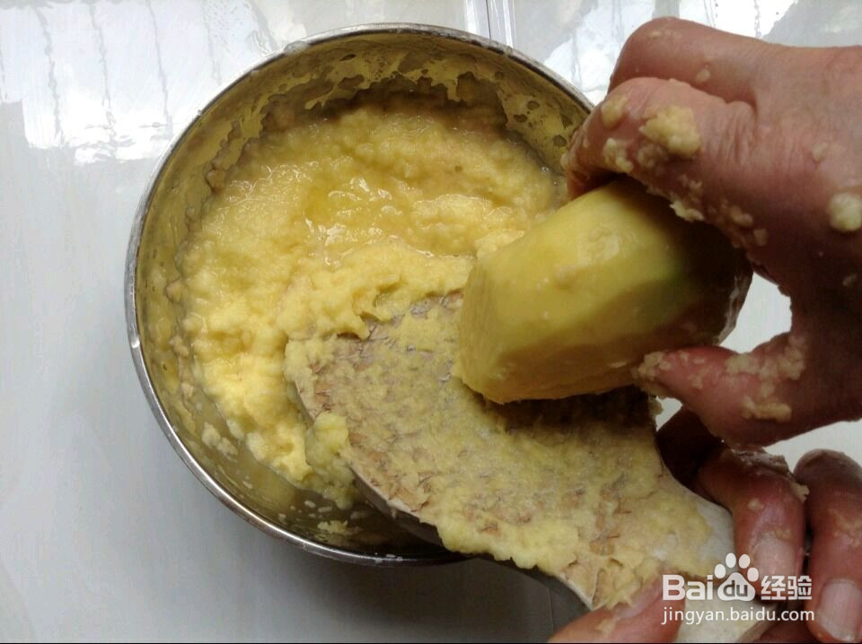 先把处理干净的土豆放在一块陶制的擦子上(用原生态的土法加工方式完成,纯工匠手艺,擦细的土豆沬煎饼,其质量非常宝贵,口感超群),擦子放在大碗内,左手扶稳,右手拿着土豆用力往下抹擦,将土豆全部擦成细沬。