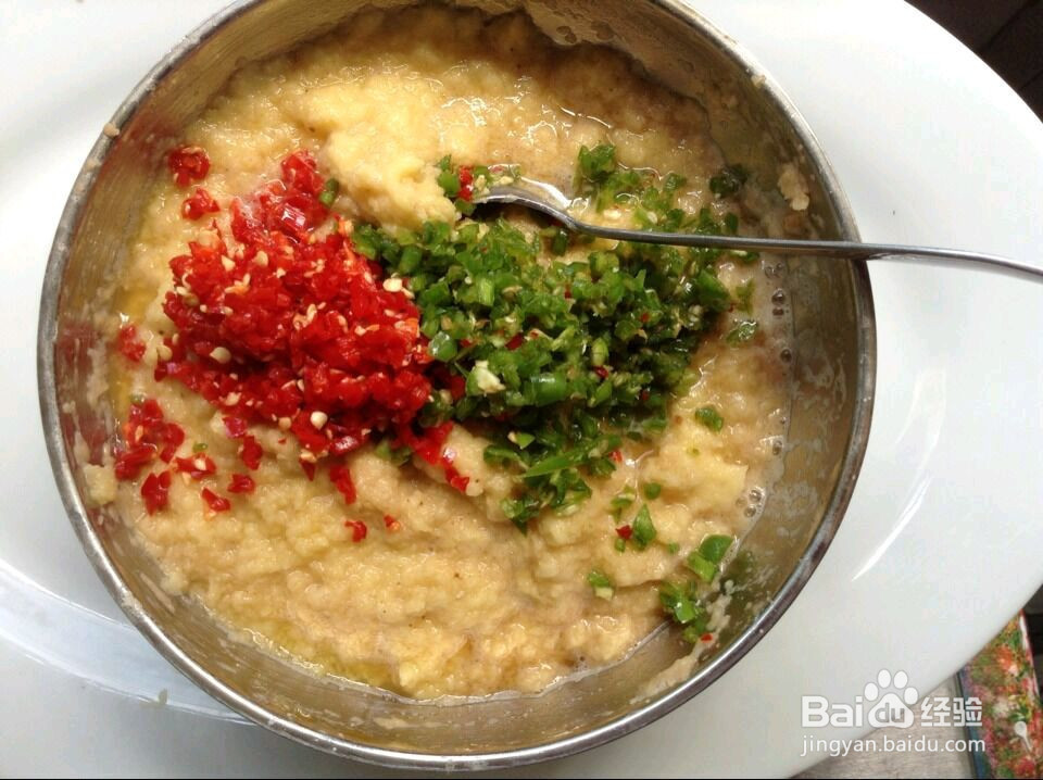 把切碎的青椒和红椒,放入装土豆沬的大碗内,并用筷子拌匀备用。