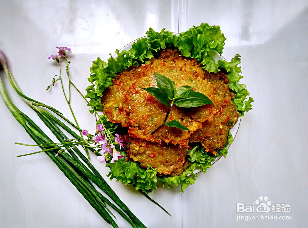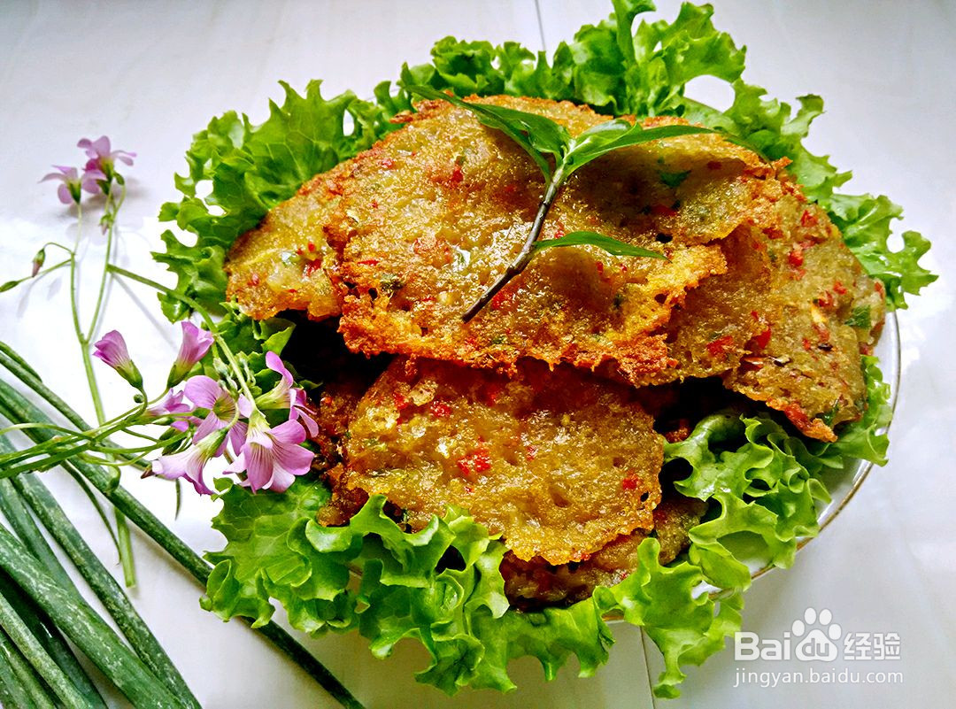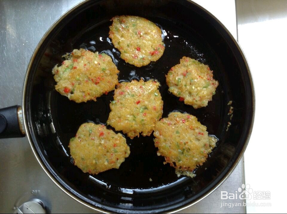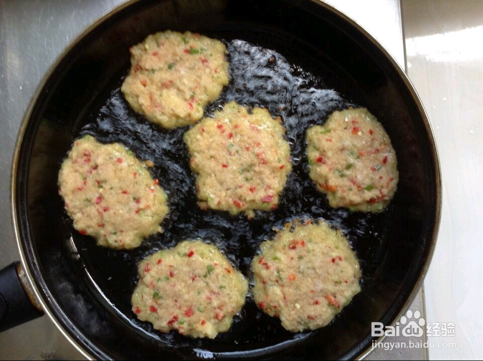 平底锅内放入适量的色拉油,待油烧至七成热时,用勺子舀起一勺拌好配料的土豆沬,放入锅中摊平,使其成为一个饼状,每锅可同时煎5一6个小饼为宜。