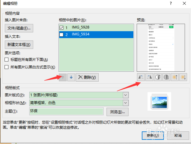 打开“编辑相册”对话框,通过相应的命令对图片的顺序、旋转角度、亮度和对比度、图片版式、相框形状等进行编辑。